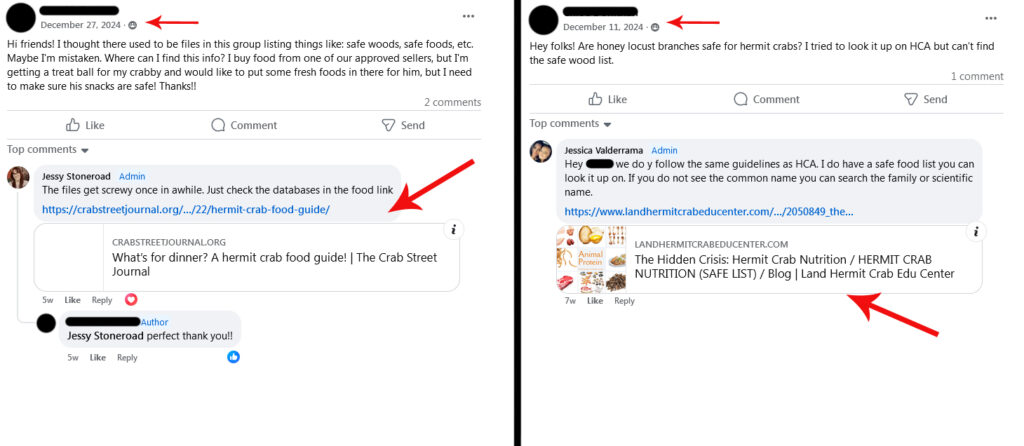 Pictured: images from two different groups, linking to the blog article on landhermitcrabeducenter.com.