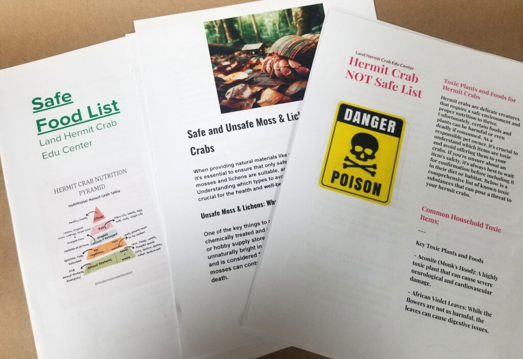 “Safe” and “Not Safe” pdfs downloaded from landhermitcrabeducenter.com, land-hermit-crab-edu-center.com; “Safe”, “Not Safe”, and Moss files – The Crabby Hermit (Hermit Crab Care and Education) “TM” Facebook Group Files. The “Safe” & “Not Safe” files from all locations were identical.