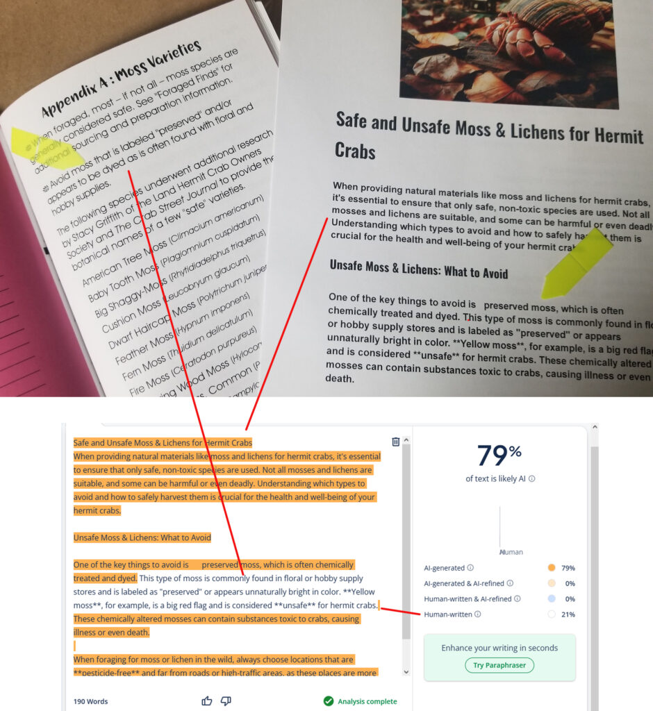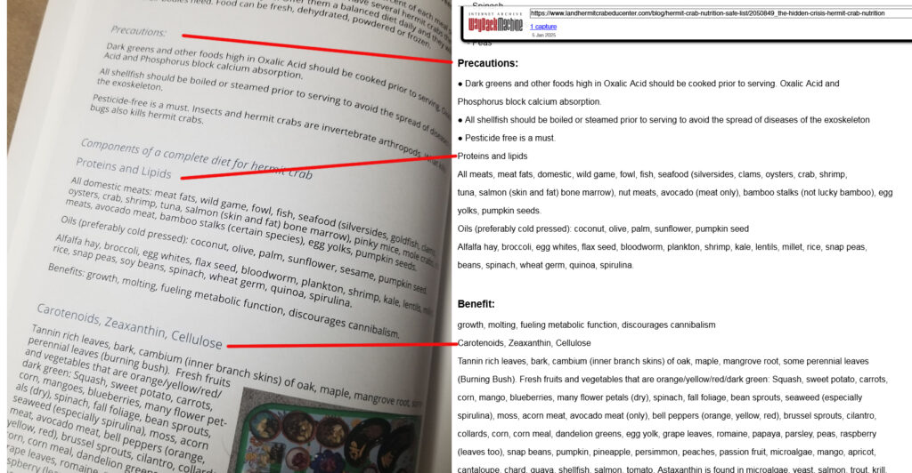 Comparison of pages 79 & 80 of “The Complete Guide…” book with the text of the blog page, “The Hidden Crisis…”, formatting disabled. The Crab Street Journal’s online file of the book’s text on these two pages is also available, free for personal use, for a word-for-word comparison: https://crabstreetjournal.org/download/hermit-crab-feeding-guide/