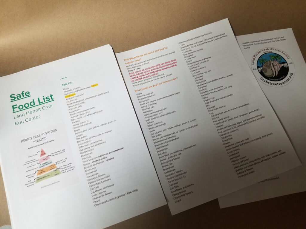 The Safe List, downloaded from the Crabby Hermit Facebook Group Files and the “Printable Guides” of the landhermitcrabeducenter.com and land-hermit-crab-edu-center.com sites, as well as viewable in the past from within the blog post is compared to the file as currently available, accessible, and free for personal use from The Crab Street Journal, “What’s for dinner? A hermit crab food guide!” article at https://crabstreetjournal.org/blog/2016/04/22/hermit-crab-food-guide/ and https://docs.google.com/document/d/113toruv4u7NJxPYdM8-xVXZ7W4duiC54EvKqrh33-pY/edit?usp=sharing