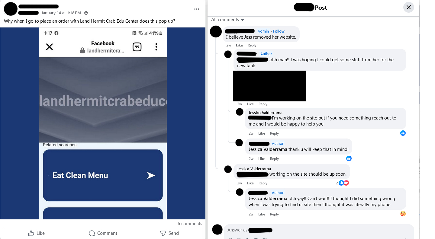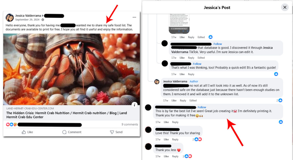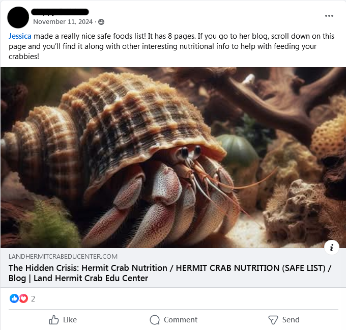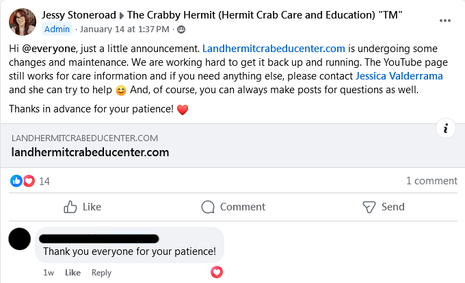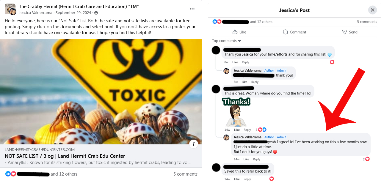 * Following the creation of the Land Hermit Crab Edu Center’s files, Jessica Valderrama began linking to those versus the original Crab Street Journal articles. With regard to care files, the other admins and moderators continued linking to Crab Street Journal sources. One instance of commenting is provided below, added 2.12.2025, to clarify that the scope of this site is focused solely on the behaviors of Jessica Valderrama at this time.